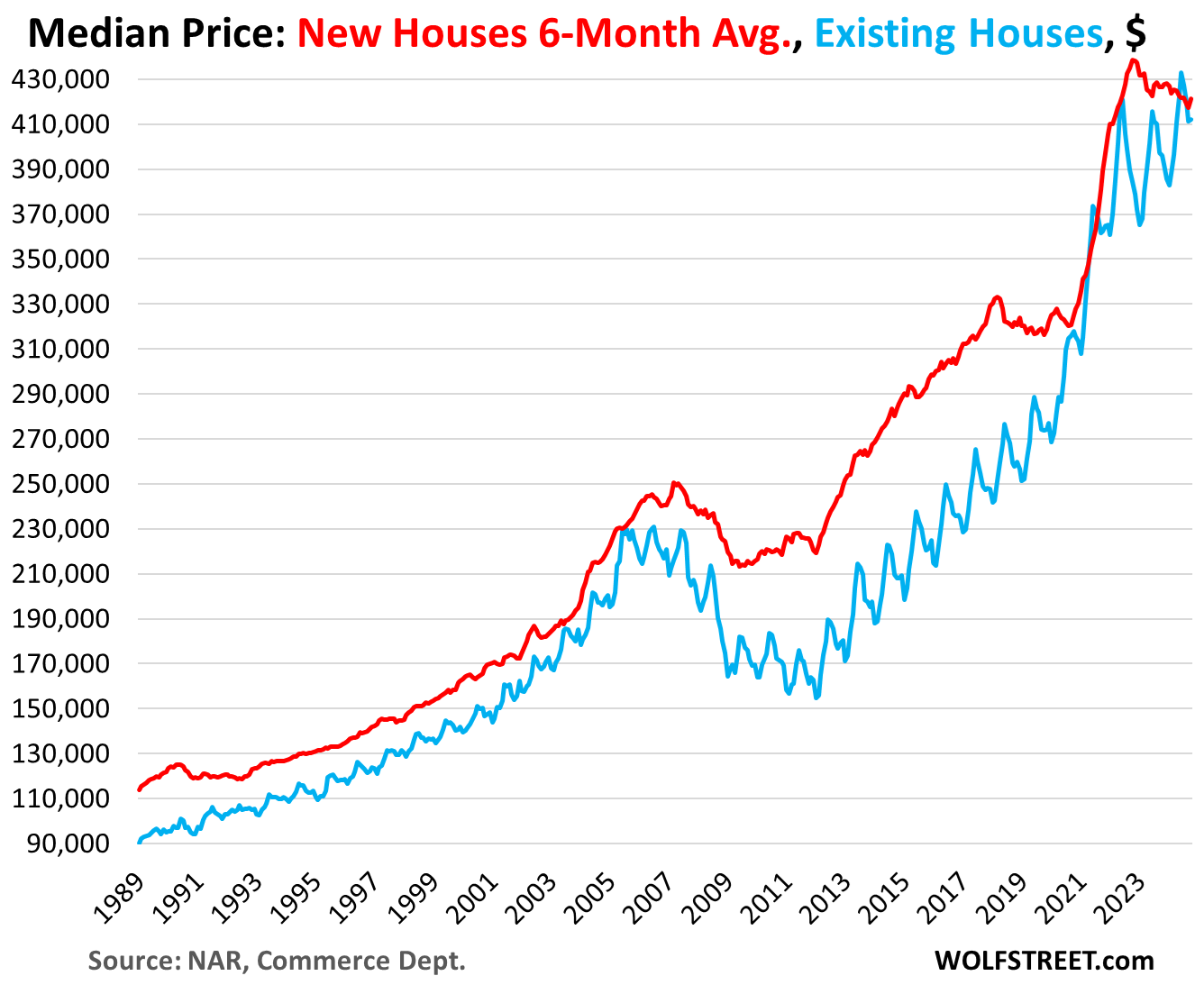 With mortgage-rate buydowns and other incentives (which are not included here), new houses on a monthly payments basis are out-competing existing houses, which is why a portion of demand has shifted from existing houses to new houses, which is why sales of new houses have largely held up, while sales of existing houses have plunged to levels not seen since 1995.