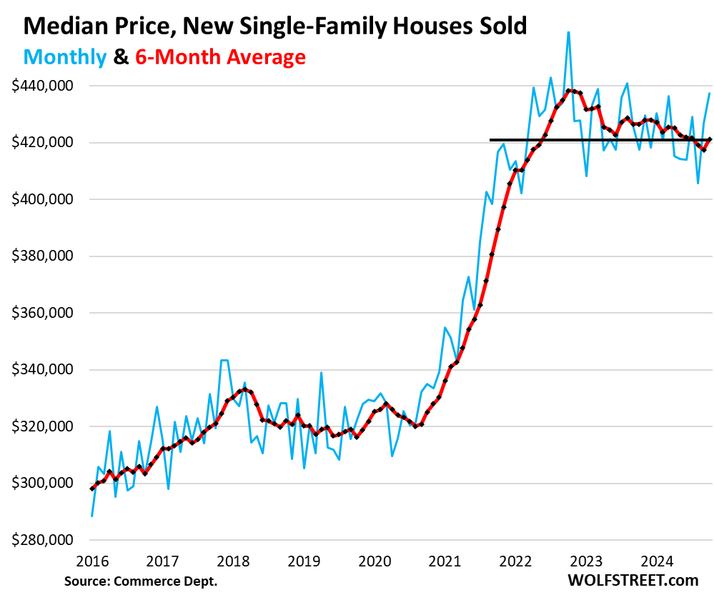 For example, Lennar disclosed that in Q3, the costs of its mortgage-rate buydowns and other incentives, such as free upgrades, jumped by 32% year-over-year to $48,100 per house it sold in Q3, which amounted to 10.2% of revenues. So this median price is only a partial measure of the pricing of new houses: