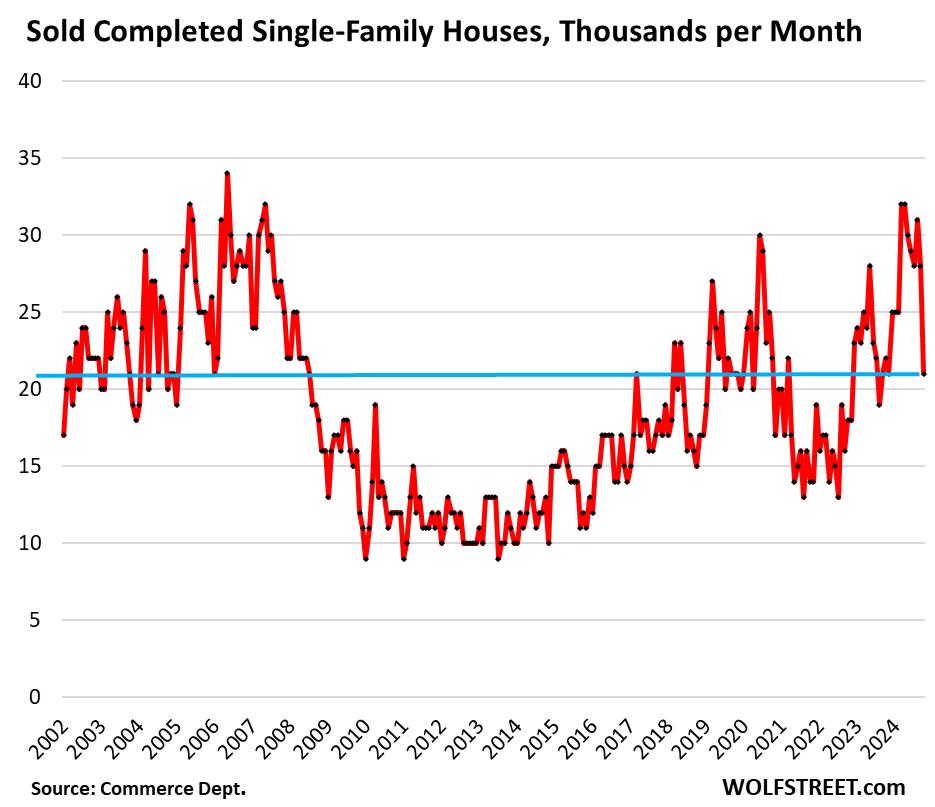 Sales of completed houses plunged 25% month-to-month in October to 21,000 houses, from 28,000 in September, and from 31,000 in August, a huge outlier, perhaps hurricane-related in the crucial South.