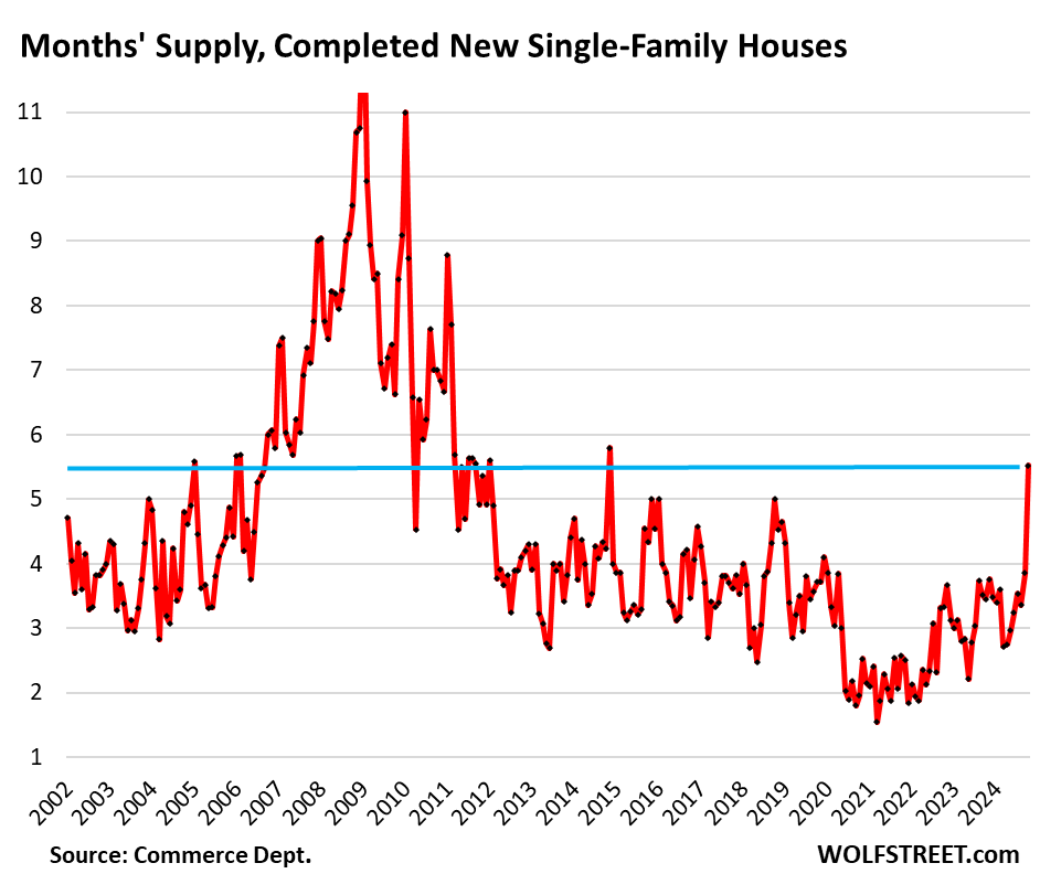 Unsold inventory of completed new houses spiked by 53% year-over-year to 116,000 houses, the highest since July 2009 during the depth of the Housing Bust when homebuilders were trying to survive.