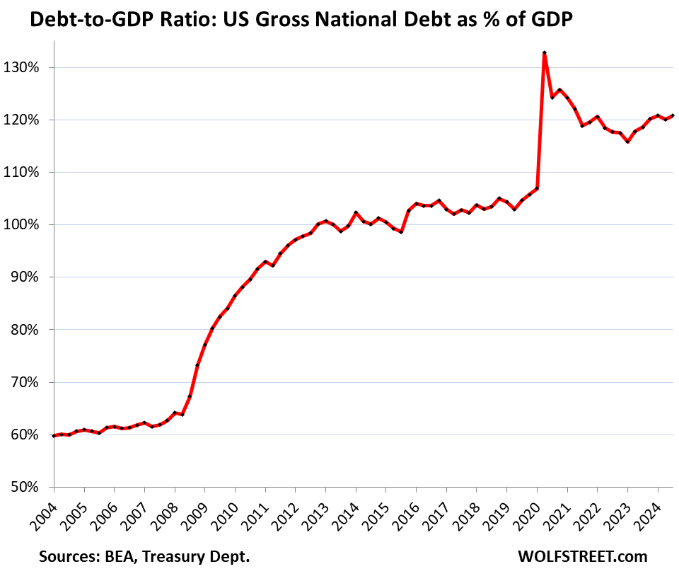 The debt has ballooned at an astounding pace year after year, for many years, including by $2.1 trillion so far in 2024 even during this strong economy. At the end of Q3, the time frame here, the debt had reached $35.5 trillion (now already at $36.1 trillion).