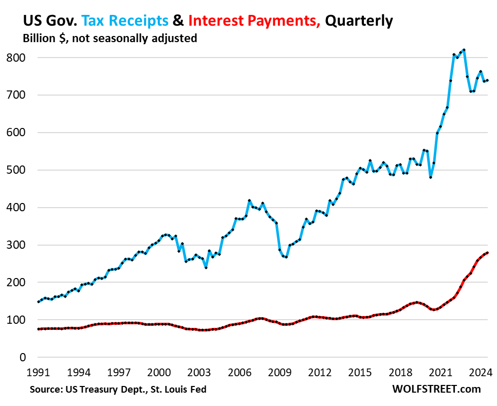 What matters the most in terms of the horribly spiking interest payments on the national debt that has exploded to $36.1 trillion by now is their relationship to the tax receipts to pay for those interest payments.