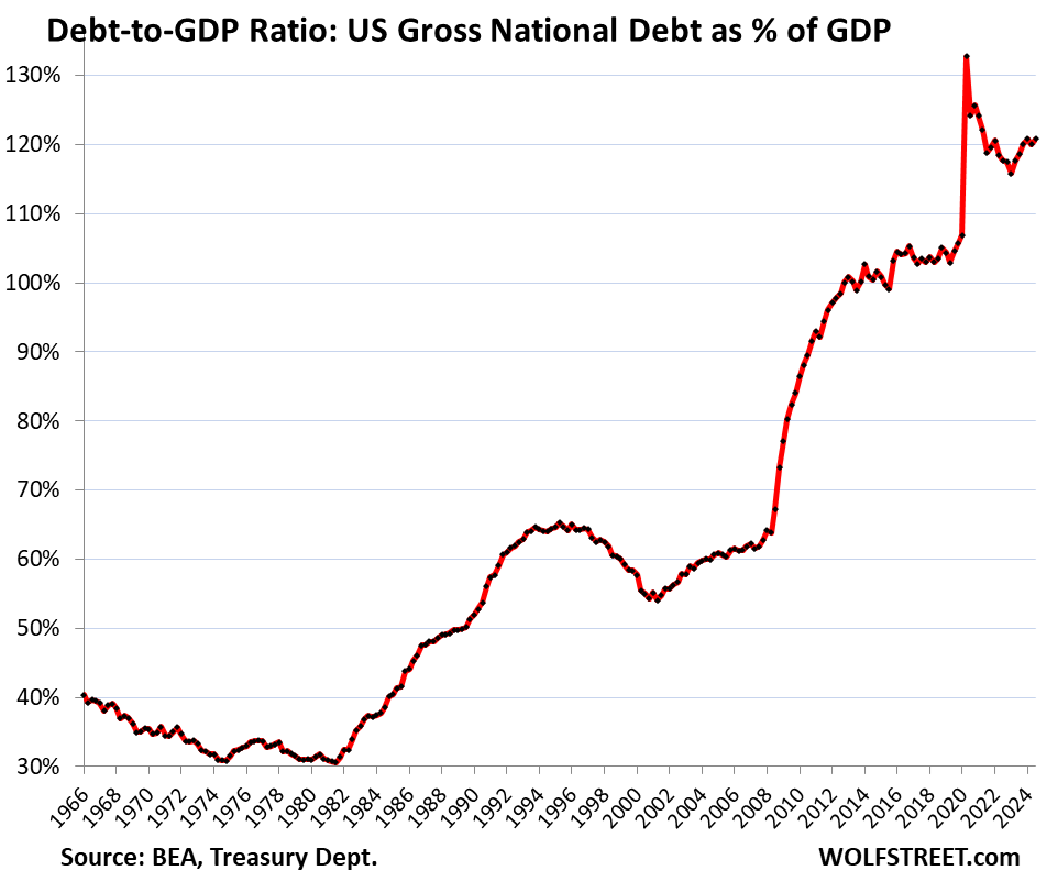 The spike in Q2 2020 was the result of the collapse of GDP during the lockdown while the national debt to pay for the stimulus programs exploded. From Q3 2020 through Q1 2023, GDP recovered faster than the debt rose, and the debt-to-GDP ratio declined. But in Q2 2023, the trend reversed as the debt surged faster than GDP rose.