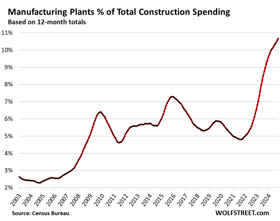 Manufacturing plants’ share of total construction spending has about doubled since 2019. In October, factory construction spending accounted for 11.1% of total construction spending. In October 2019, it had accounted for 5.5% of total construction spending.