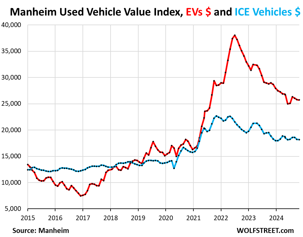 Both have come down from that spike but not nearly enough, and used EV prices remain far higher than ICE prices.