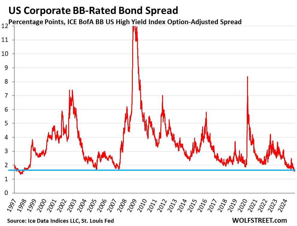 Corporate borrowing costs – including Commercial Real Estate – are much higher than they had been in 2021. It’s just that credit-market mania has crushed risk premiums, to where investors are demanding only a little extra compensation in form of yield to take on a lot more credit risks.