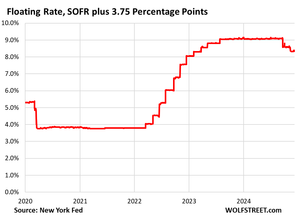 SOFR on Friday was 4.60%, according to the New York Fed, which calculates and publishes SOFR. That’s right in the middle of the Fed’s five policy rates since the November rate cut, ranging from 4.50% to 4.75%. SOFR plus 3.75% would be 8.35%, compared to about 3.80% in 2021.