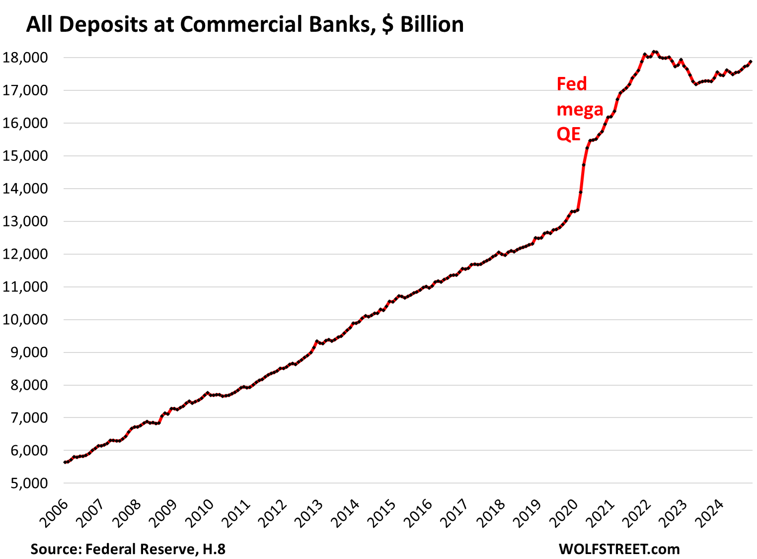 Three banks collapsed during that time – Silicon Valley Bank, Signature Bank, and First Republic – and another was forced to shut down by regulators – Silvergate Capital – because depositors tried to yank their cash out all at the same time. But starting in June 2023, deposits started slowly rising again and have by now regained a large portion of the plunge: