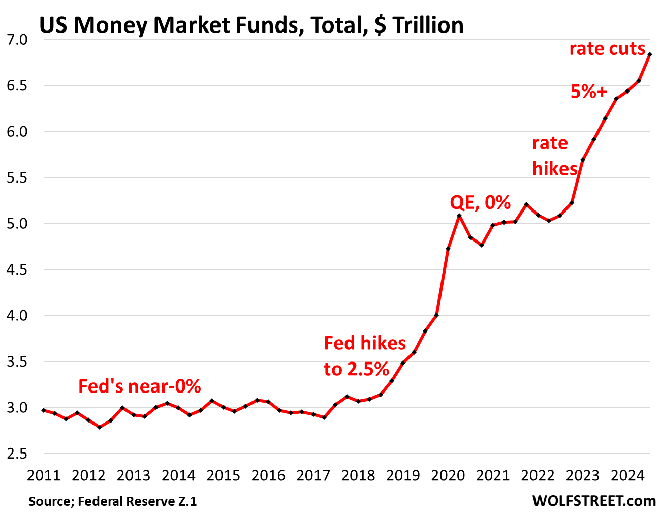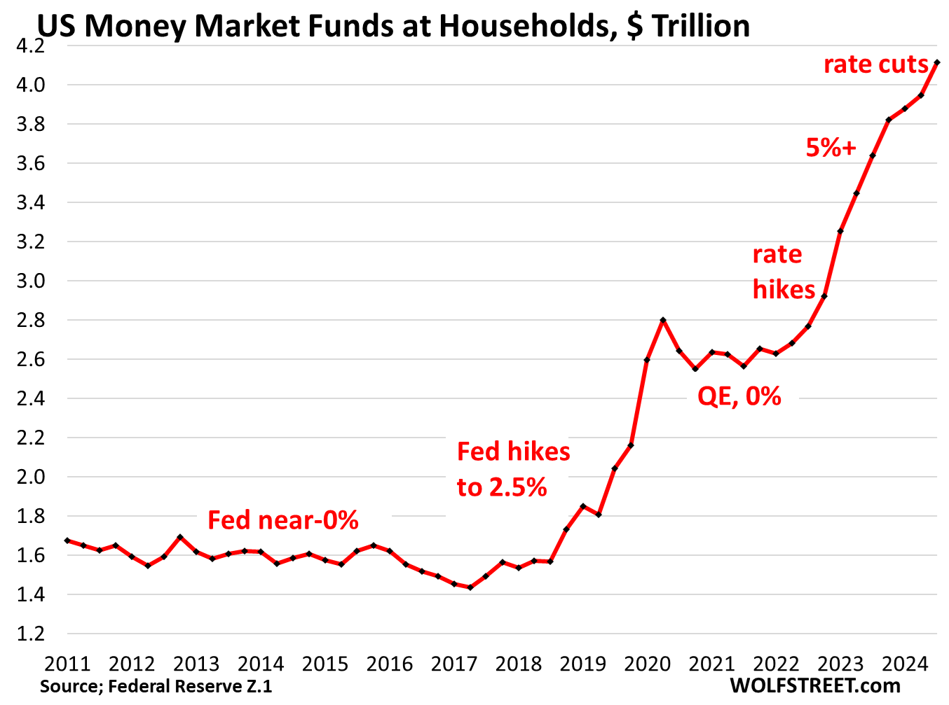 Yields of MMFs roughly parallel three-month Treasury yields but are often a little higher. Three-month Treasury yields started descending in July from about 5.36%, and by September 18, the day of the rate cut, were down to 4.76%, and by the end of September, they were down to 4.60%. But even those lower yields were still good enough, and households poured more cash into MMFs in Q3.