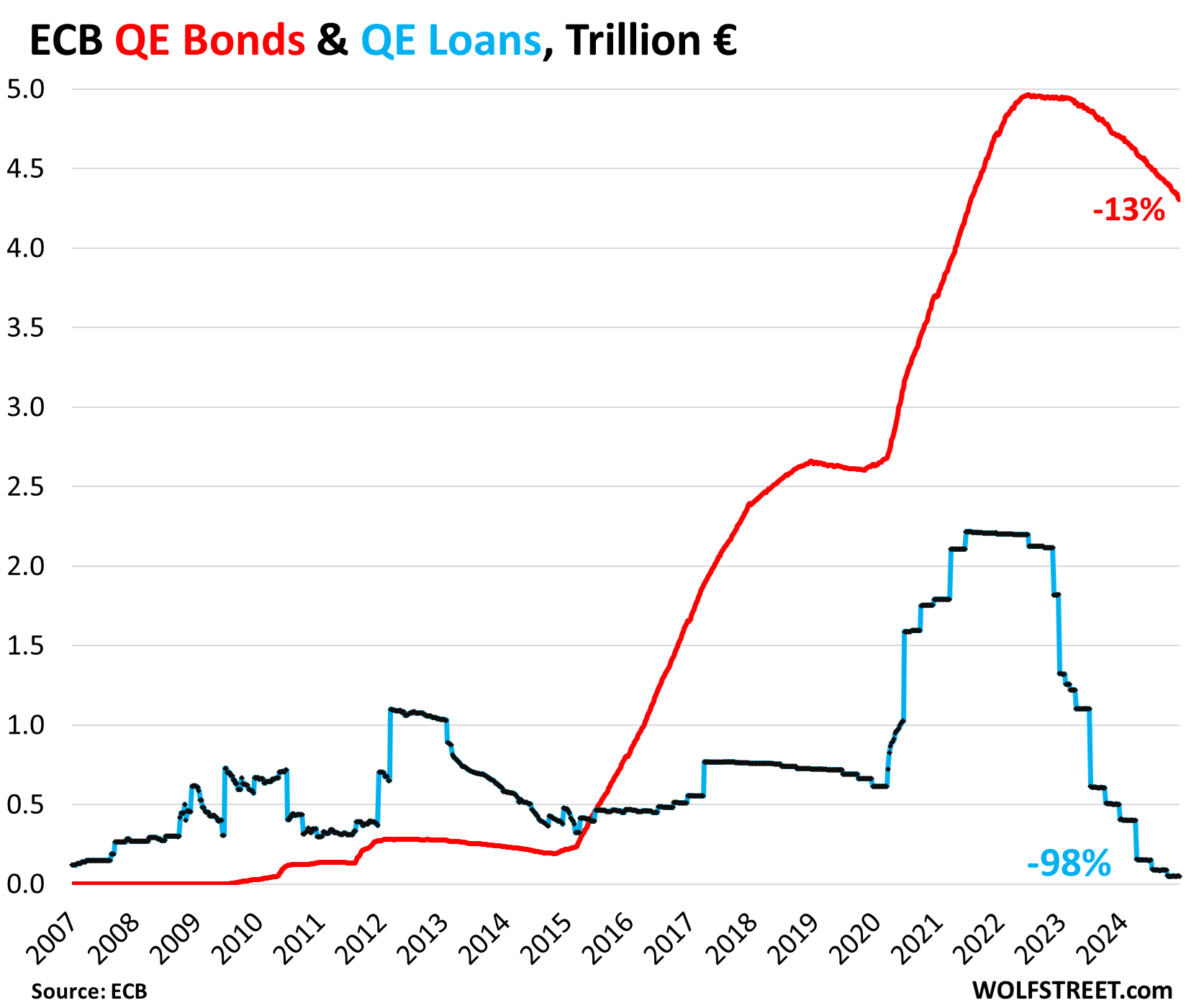 The ECB had two QE programs: Loans to banks that peaked in June 2021 at €2.22 trillion; and the bond buying programs APP and PEPP, which peaked in June 2022 at €4.96 trillion combined. Bonds under these programs include a broad range of government and private-sector securities, but mostly government securities.