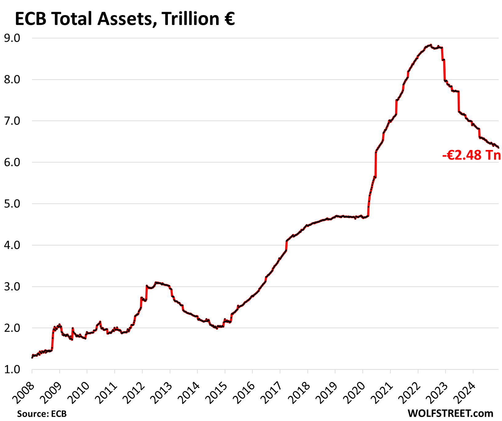 The ECB’s QT program has already reduced its balance sheet by €2.48 trillion in total, or by about 28%, since late 2022.