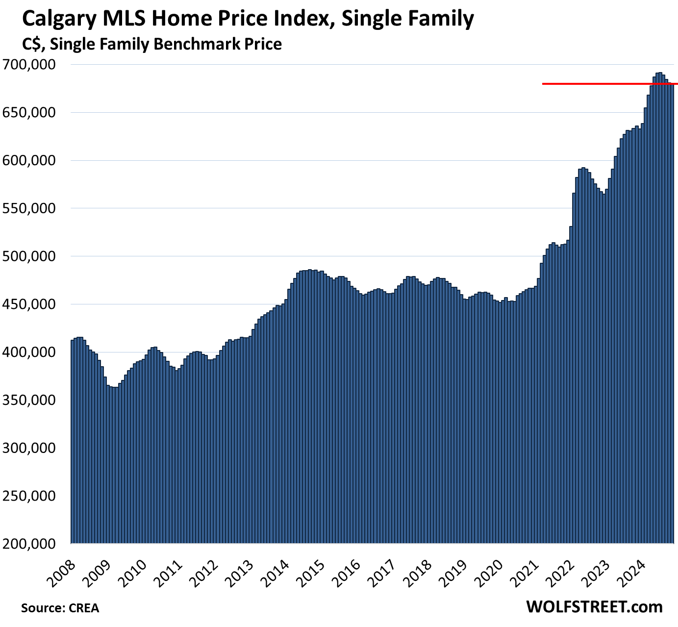 • Month-to-month: -0.1%, to $680,200, fourth month-to-month decline after huge two-year spike.