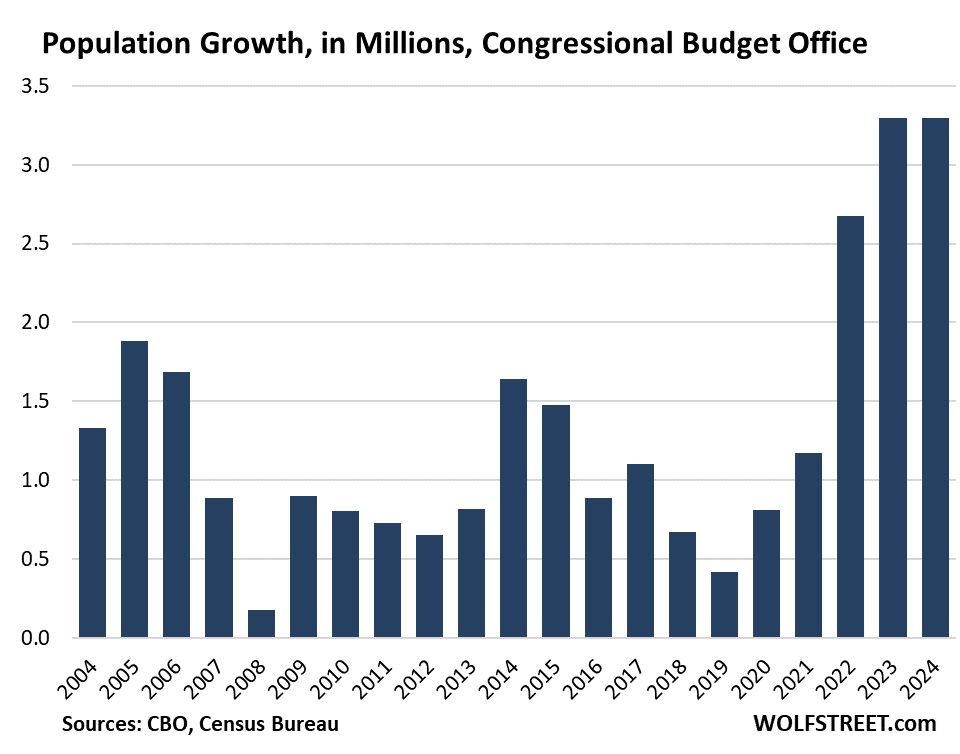 The wave of immigration contributes to demand growth. The US population has surged in 2022 and 2023 by 6 million people due to immigration, and in 2024 has continued to rise, according to the Congressional Budget Office, using ICE and Census data.
