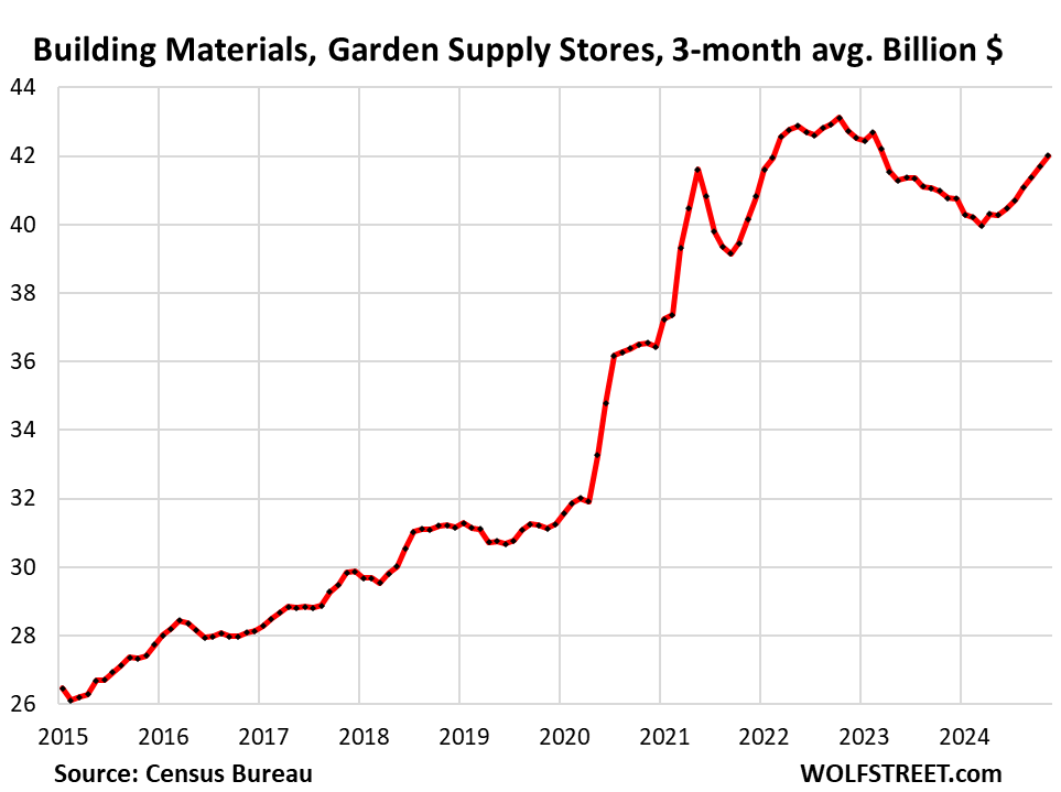 Building materials, garden supply and equipment stores (6% of total retail). The pandemic remodeling boom petered out in late 2022, and sales fell for a while. Starting in June this year, sales began rising again, though they remain well below the peak of the pandemic boom:
