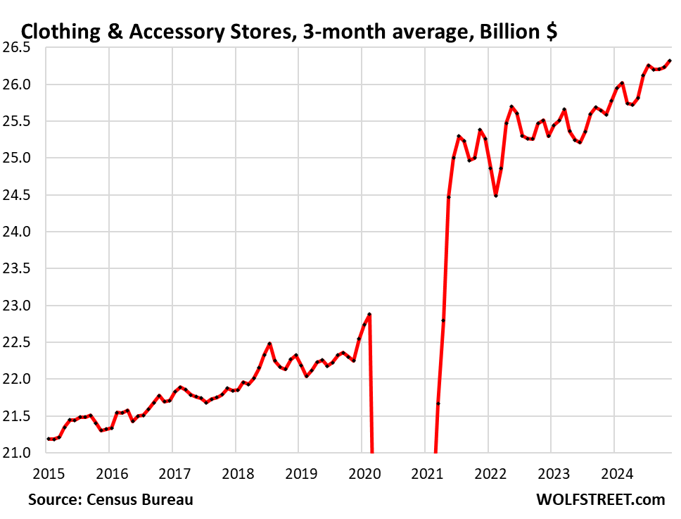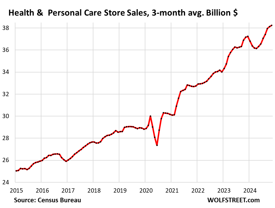 Health and personal care stores (5% of total retail). Note the sharp drop in early 2024, but in May, sales began to recover: