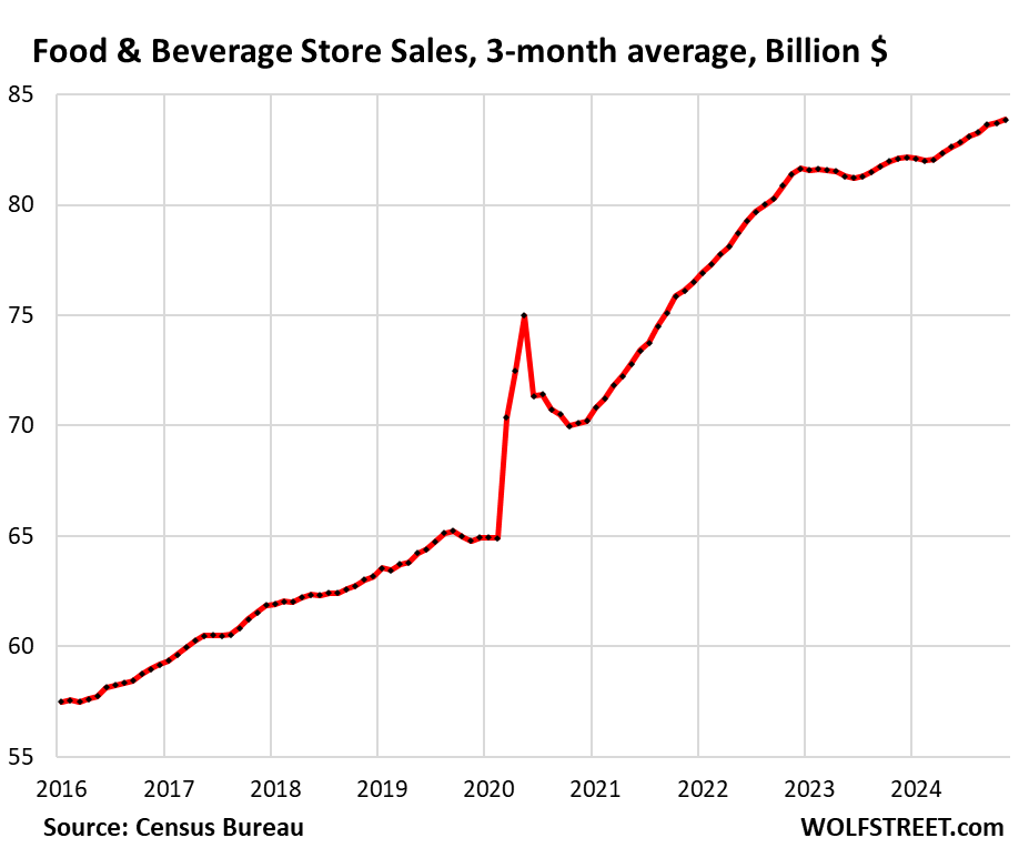 Food and Beverage Stores (12% of total retail). Prices per CPI for food at home exploded from 2020 to early 2023, which caused the spike in sales, then flattened out at high levels for a while, before starting to rise again: