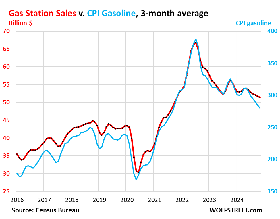 Gas stations (7% of total retail sales). Dollar-sales at gas stations move in near-lockstep with the price of gasoline. The price of gasoline plunged starting in mid-2022 and has continued to trend lower. These price declines push down dollar-sales at gas stations. Sales at gas stations also include all the other merchandise gas stations sell.