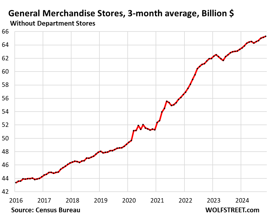 Retail sales jumped by 0.7% in November from October, to $720 billion, seasonally adjusted, and October was revised higher (blue in the chart below), and so we look at the 3-month average (red in the chart), which irons out the month-to-month squiggles and includes the revisions, and it jumped by 0.7% as well.