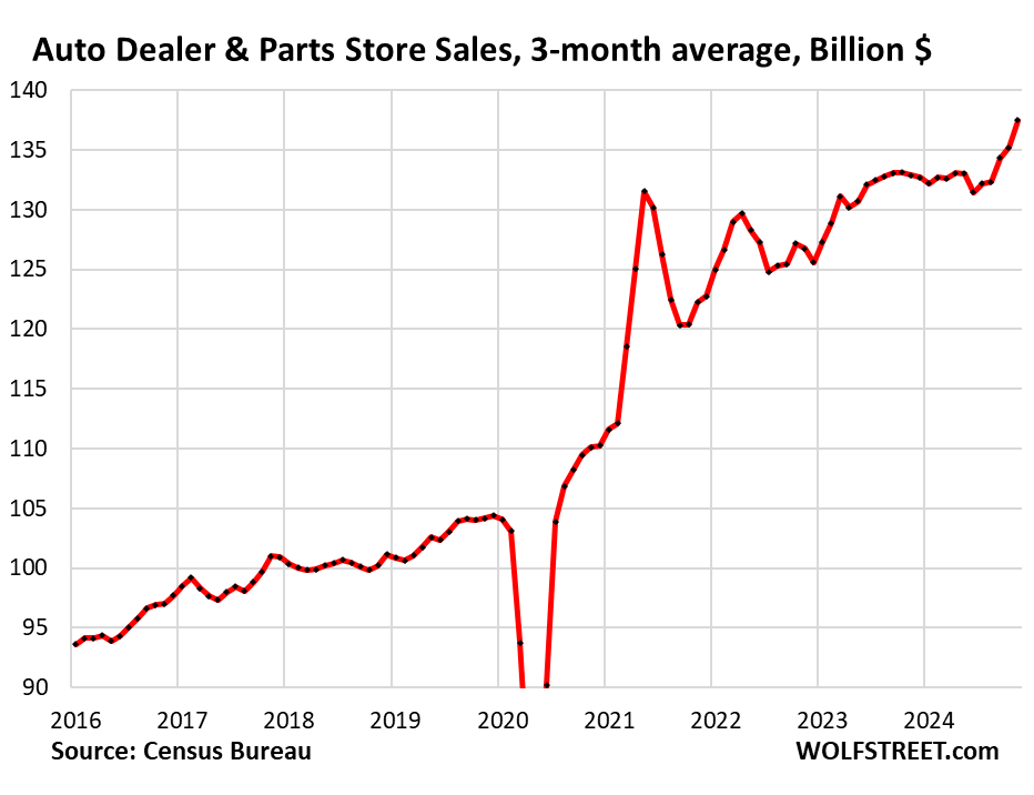 The spike in dollar-sales in 2021 and 2022 was caused by ridiculous price increases. Starting in mid-2022, prices dropped overall, with used vehicle prices plunging. These price declines caused the dollar-sales for those 18 months to flatten out, despite rising retail unit-sales.