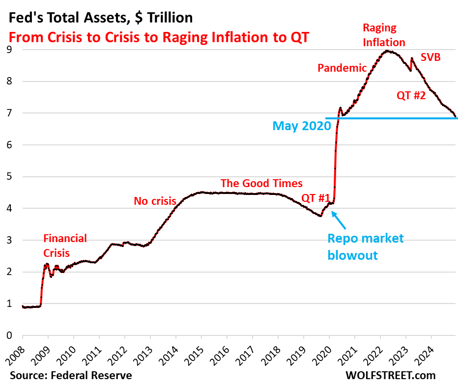 The SRF is what the Fed used before 2008, before QE and before the “ample reserves regime,” to supply liquidity to the banking system, and it worked, no QE needed, not even during a crisis. It seems the Fed is laying down another paving stone on its path back to how it used to do it before QE. This will be a very slow process, and I’m speculating here, but it seems the Fed is preparing to drain reserves via QT to get back to scarce reserves, years from now, very slowly. I started reporting on this path in July 2021, when it revived its SRF, which Bernanke had shut down in 2009.
