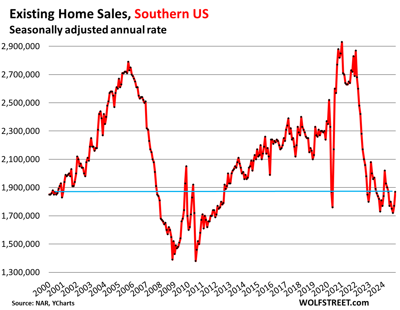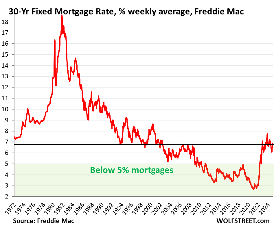But the 2023 and 2024 demand destruction was caused by a gigantic spike in prices – the NAR’s national median price shot up by nearly 50% from June 2019 through June 2022 – and then in 2023, mortgage rates returned to normal-ish levels in the 6%-7% range, up from the pandemic’s free-money range of less than 3% (historical data from YCharts).