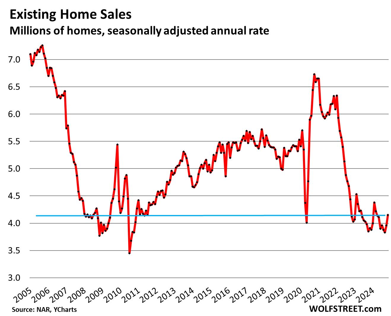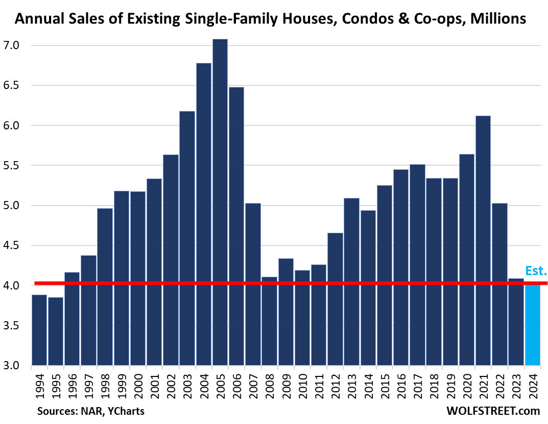 The demand destruction in 2024 has been even larger than during the Housing Bust. With today’s actual sales figures for November (not seasonally adjusted), the WOLF STREET estimate for the whole year 2024 comes in at 4.04 million sales, the lowest since 1995, below even the worst years during the Housing Bust.