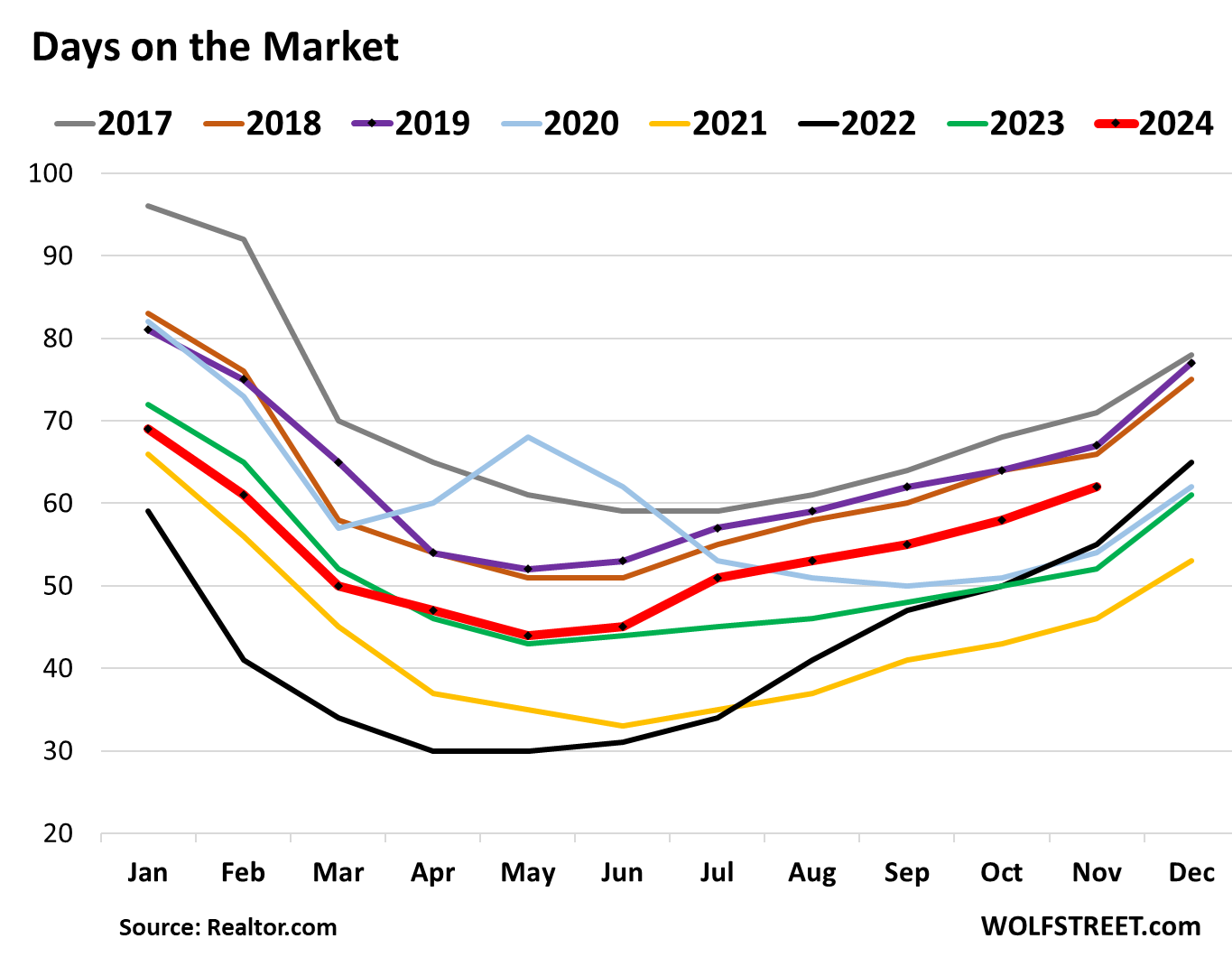 The median number of days before the home is either sold or pulled off the market because it failed to sell rose to 62 days in November, the most for any November since 2019, and up from 52 days a year ago, according to data from Realtor.com.