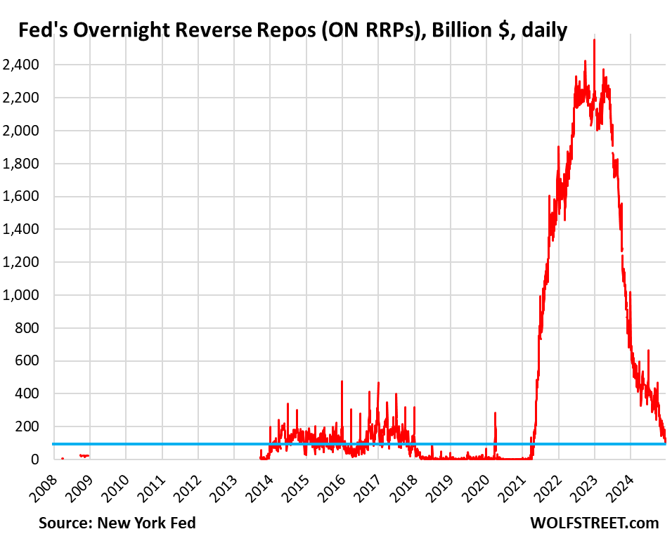 Balances at the Fed’s facility for Overnight Reverse Repurchase agreements (ON RRPs) fell to $98 billion on Friday, the lowest since April 2021, down from $2.4 trillion from the peak at the end of December 2022, and well on their way to zero or near-zero, where they were in normal times, and where the Fed wants them to be again.