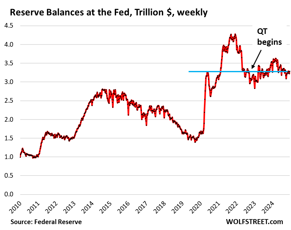 But QT has so far only drained ON RRPs, while reserves, currently at $3.28 trillion, are still where they had been when the Fed started QT in the summer of 2022. As far as reserves are concerned, QT hasn’t even started yet, and there is still quite a ways to go before they get to “ample.”