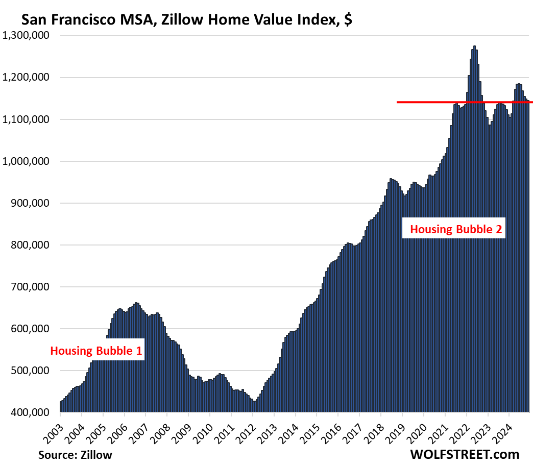 And the City lost people, and it lost jobs, especially jobs in tech and finance. And home prices began to careen down, but it’s a slow bumpy process.