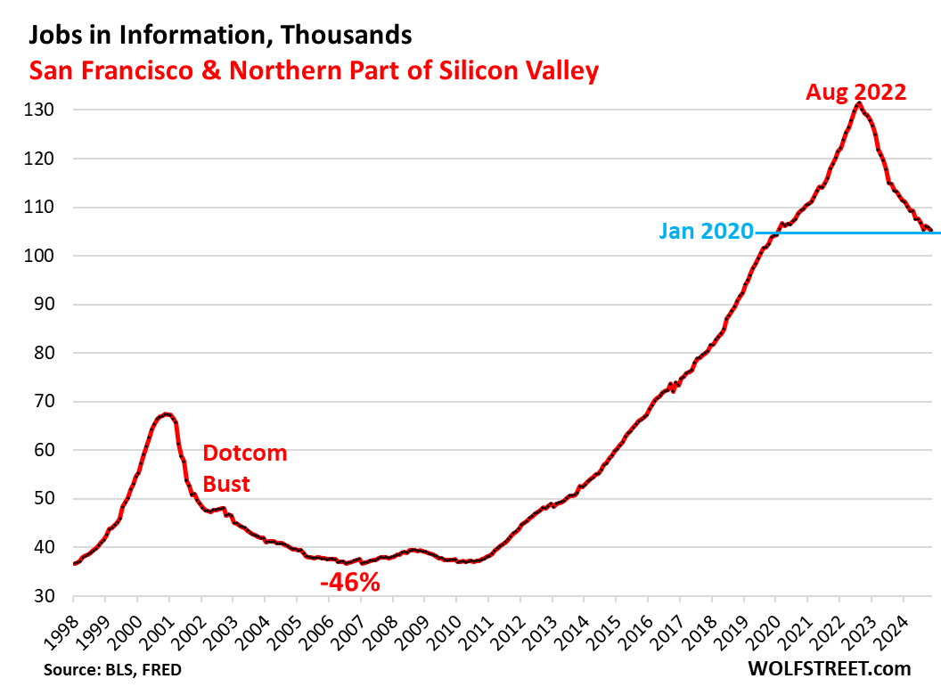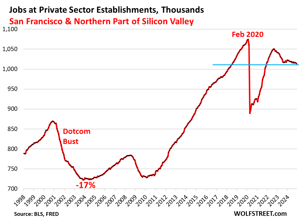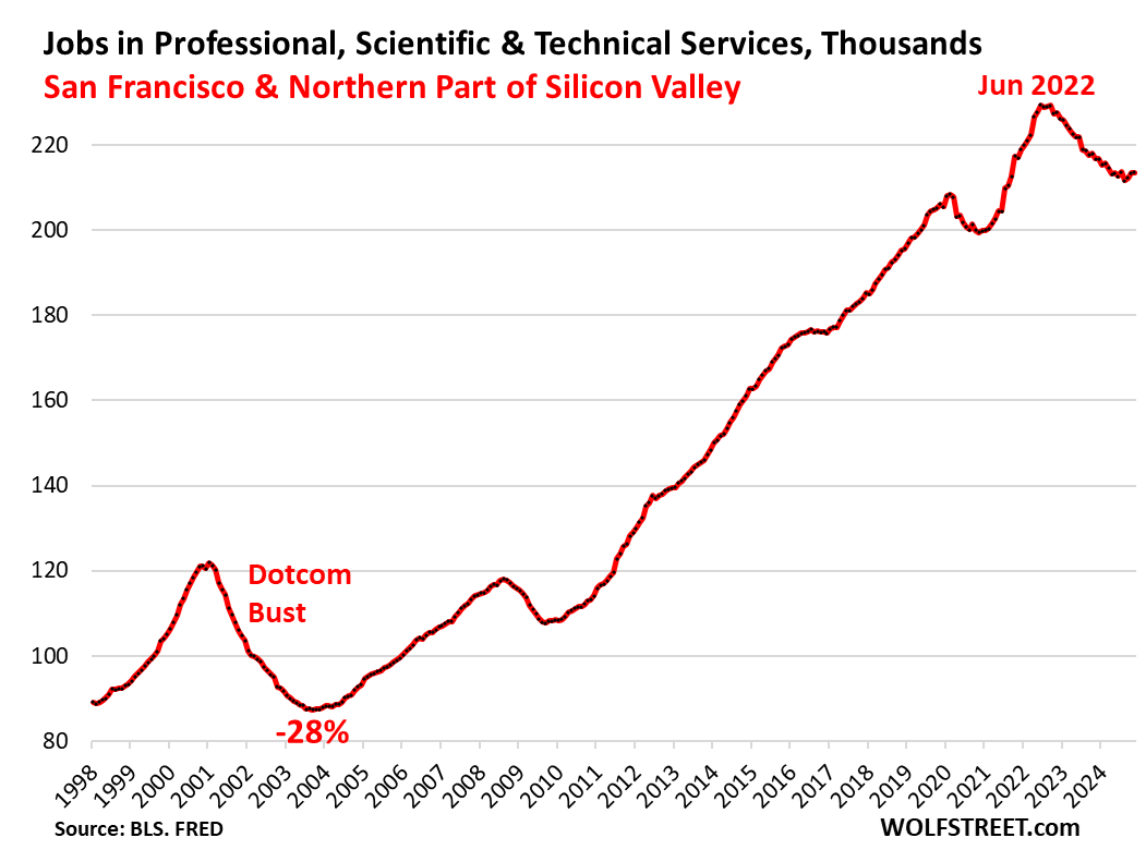San Francisco and the northern part of Silicon Valley – the counties of San Francisco and San Mateo which make up the San Francisco-Redwood City-South San Francisco Metropolitan Division – have been among the epicenters of tech jobs in the US, and the epicenter of tech job booms and busts.
