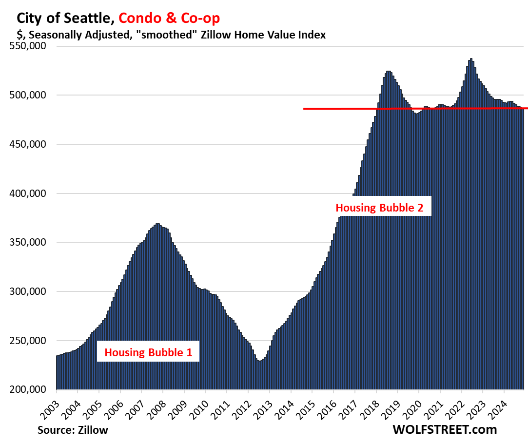 Many of the condos in Seattle would be owned by the Chinese when they were crushed with new taxes in Vancouver, Canada back in April 2017. If the Yuan keeps falling the condo prices will keep falling in Seattle.