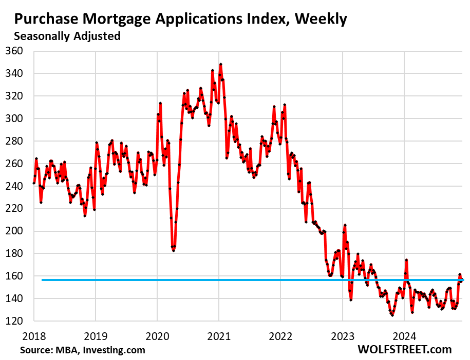 Applications for mortgages to purchase a home in the latest reporting week, seasonally adjusted, rose 5.6% from the collapsed levels a year ago, but were still down by 14% from the same period in 2022, by 45% from 2021, and by 40% from 2019, according to data from the Mortgage Bankers Association. Mortgage applications are an early indication of home sales – so like pending sales, up a little from rock bottom, but still in the frozen zone: