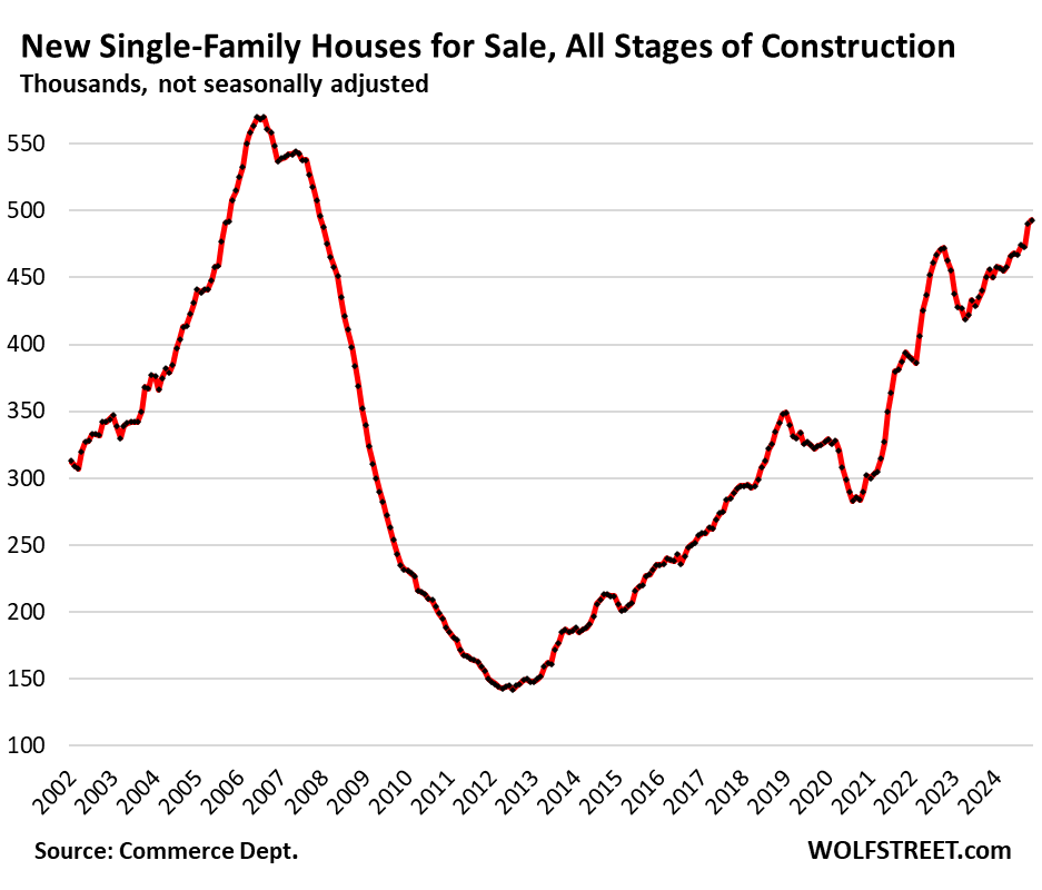 Inventory of completed new houses for sale spiked by 57% year-over-year to 124,000 houses in November, according to Census Bureau data. This is supply to the overall housing market. Homebuilders are trying to find buyers for these completed “spec” houses by piling on incentives, including costly mortgage-rate buydowns, and by cutting prices, thereby bringing monthly payments below those of equivalent existing homes, and their sales have held up reasonably well, while existing home sales have plunged to historic lows, from which they’re now inching back up.