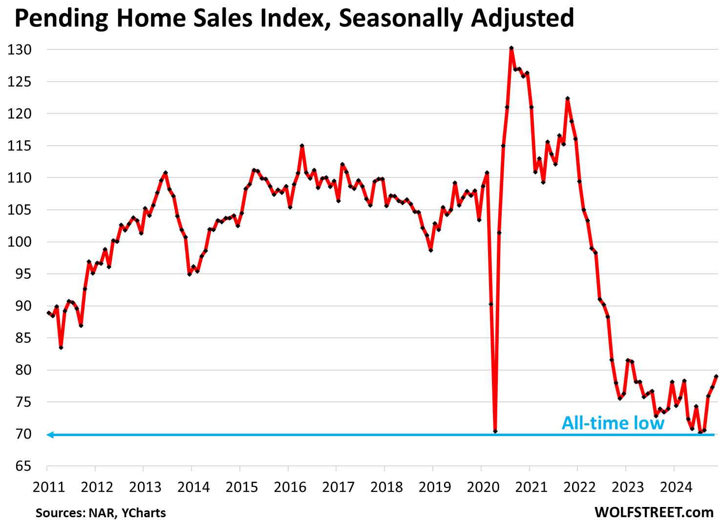 Compared to the collapsed levels in November last year, not seasonally adjusted pending sales rose 5.6%, while seasonally adjusted pending sales rose 6.9%. July had set an all-time low in the history of the data.