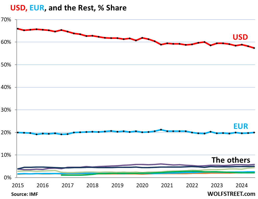 But by the 1990s, central banks loaded up on dollar-assets again, until the euro came along. This chart shows the dollar’s share at the end of each year (2024 = Q3).