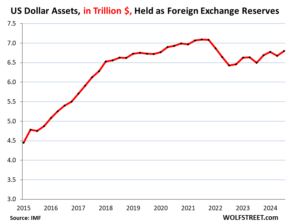 The share of USD-denominated foreign exchange reserves fell to 57.4% of total exchange reserves the lowest since 1994, according to the IMF’s COFER data for Q3 2024. USD-denominated foreign exchange reserves include US Treasury securities, US agency securities, US MBS, US corporate bonds, US stocks, and other USD-denominated assets held by central banks other than the Fed.