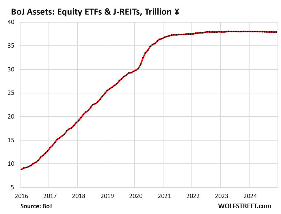 It’s hard to say what impact selling the ETFs and J-REITs would have. The Japanese stock market is small compared to the US stock market. ETFs and J-REITs are a small portion of that. The BOJ holds $240 billion of them valued at cost. But it bought those many years ago and stopped buying in 2021. Japanese stocks have surged 370% over those years. So its pile of ETFs might be trading at around $700 billion now, just guessing. And selling those, just announcing that it would sell them, will have some impact. If it sells them at all, it would likely announce well in advance that it would trickle them out at such an unnoticeably minuscule pace that it would take forever to get rid of them. The BOJ is in no mood to dent Japanese stocks.