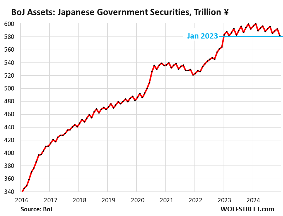 Japanese government securities: -¥18 trillion (-$114 billion), or -3.1%, from the peak in February 2024, to ¥582 trillion ($3.68 trillion) on the balance sheet at the end of December, released today. They’re now below where they’d first been in January 2023.