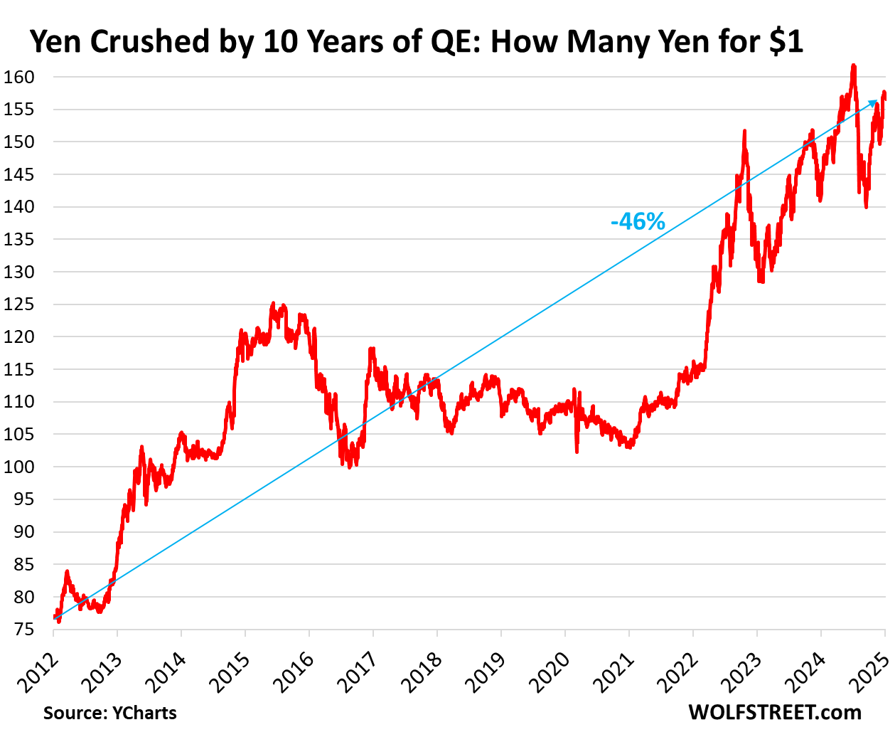 The BOJ’s grand money-printing era started in 2012 under the doctrine of Abenomics and lasted into 2024. During this period, the yen plunged by 46% against the USD, from 85 YEN to the USD in 2012, to 157 now. The exchange rate is where the free money came home to roost.