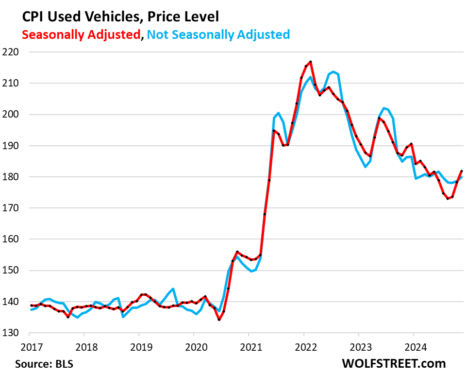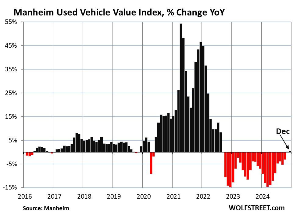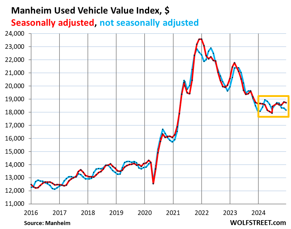 Seasonally adjusted, prices in November had inched up to the highest level since October 2023, and in December, backed off by $89, to the second highest level since October 2023 (red line), according to the Manheim Used Vehicle Value Index, which is adjusted for changes in mix and mileage. Manheim is the largest auto auction house in the US and a unit of Cox Automotive.