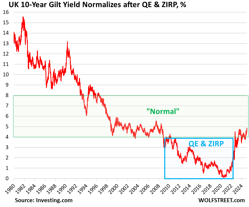 But the thing is, today’s 10-year gilt yield is back in the normal range – normal before ZIRP and QE. It’s actually at the low end of the normal range, and just barely above the BoE’s short-term Bank Rate. It’s at the low end of where it should be in normal times.