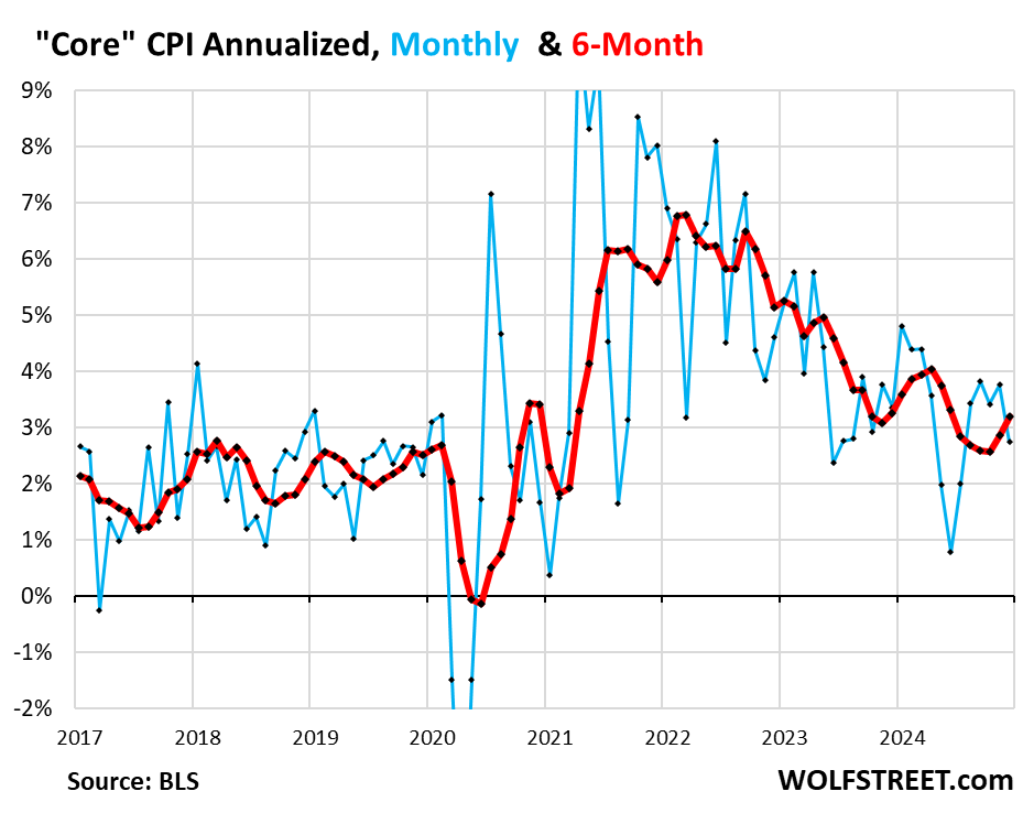 The three-month CPI, which irons out some of the month-to-month squiggles. jumped by 3.9% annualized, the sharpest increase since April, and the fifth month-to-month acceleration in a row.
