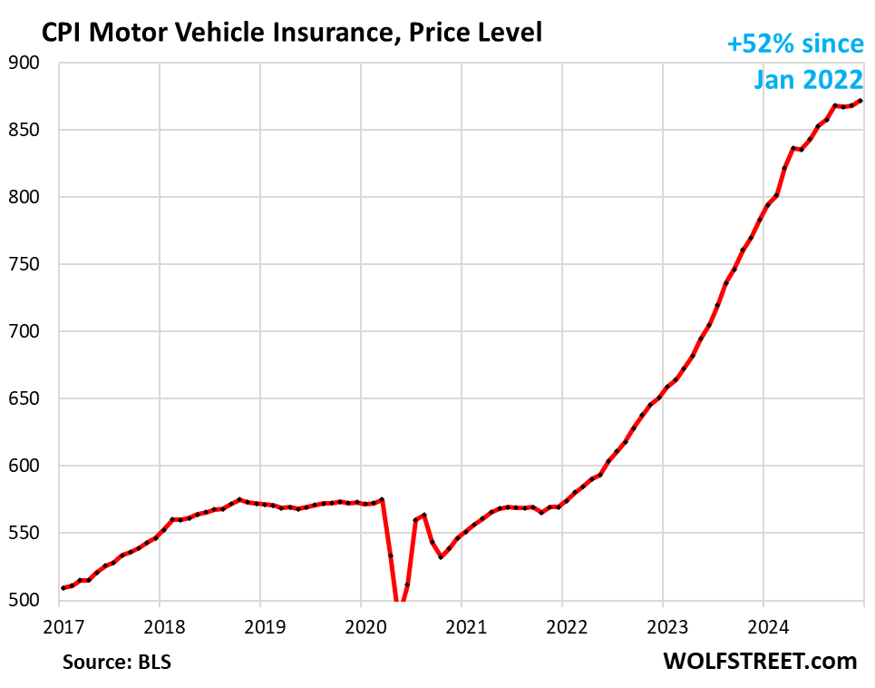 Since January 2022, it exploded by 52%, driven the historic spike in used vehicle prices, and therefore replacement costs for insurance companies, and by surging repair costs.