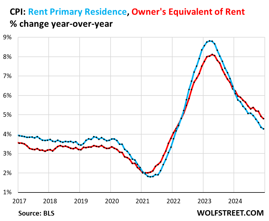 Year-over-year, both continued to decelerate: OER CPI +4.8% (red), Rent CPI +4.3% (blue), but both remain well above the range before the pandemic.