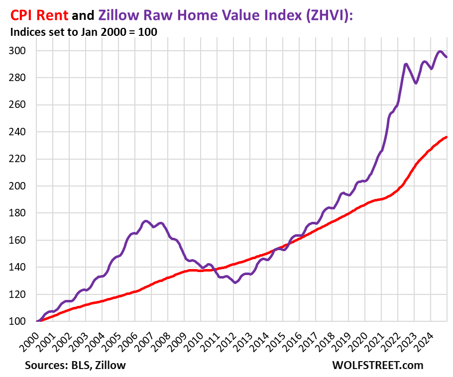 Rent inflation vs. home-price inflation: The red line in the chart below represents the CPI for Rent of Primary Residence as index value. The purple line represents Zillow’s “raw” Home Value Index for the US. Both indexes are set to 100 for January 2000 [here are the largest, most expensive 33 metros: The Most Splendid Housing Bubbles in America ]: