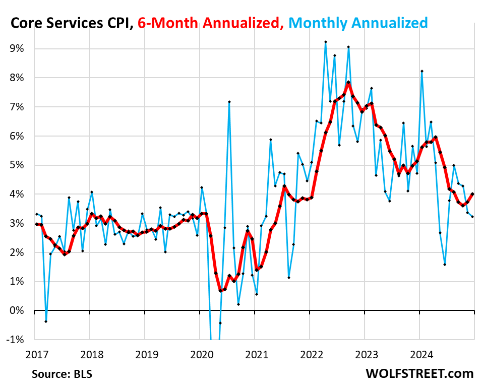 The 6-month core services CPI, which irons out a lot of the month-to-month squiggles, accelerated to 4.0% annualized, the worst since August (red).