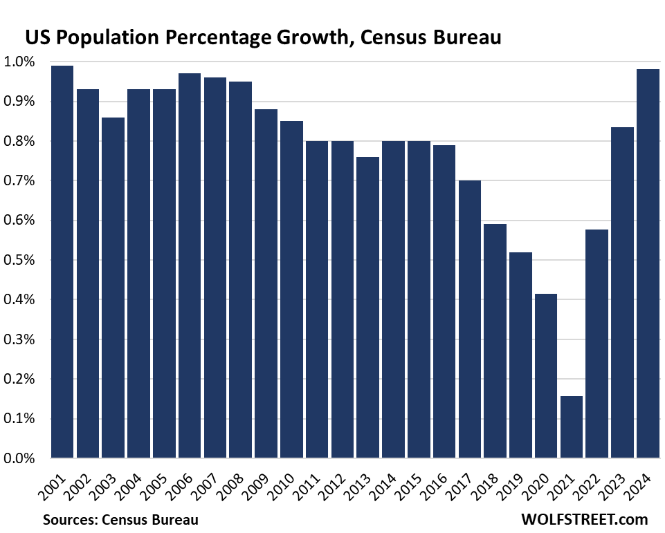 And there are a lot more consumers: net immigration added 2.8 million people to the population in the 12 months through July 2024, and 4.0 million over the prior two months, and so the population of the US over those three years soared by 2.4%, including by nearly 1% over the 12 months through July, the biggest percentage growth rate since 2001, according to the population updates by the Census Bureau in December.