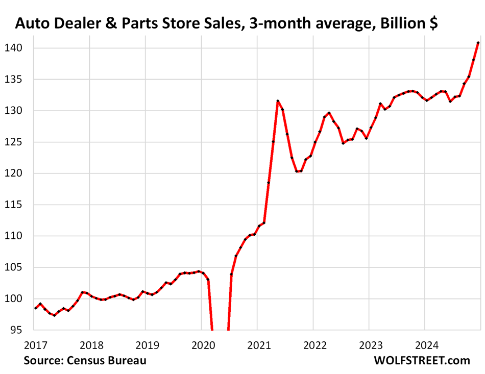 New and used vehicle dealers and parts stores, the second largest category in December: Sales on a three-month average basis soared by nearly 2% (seasonally adjusted) in December from November, and by 7.5% year-over-year (not seasonally adjusted) to $141 billion. This was a very strong finish of a year that had started out somewhat slow-ish.