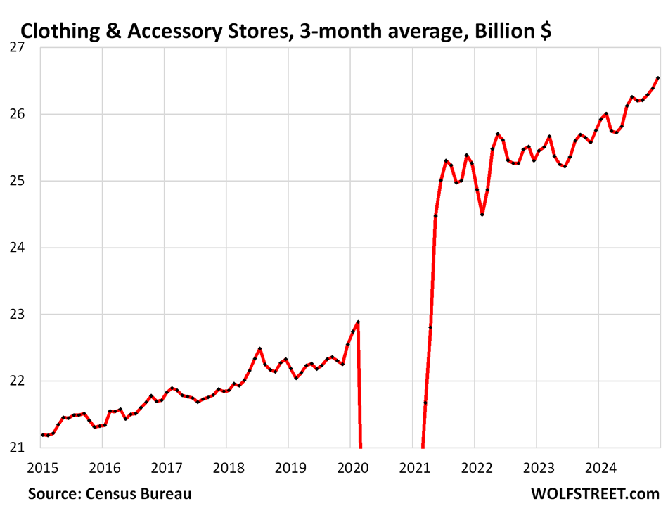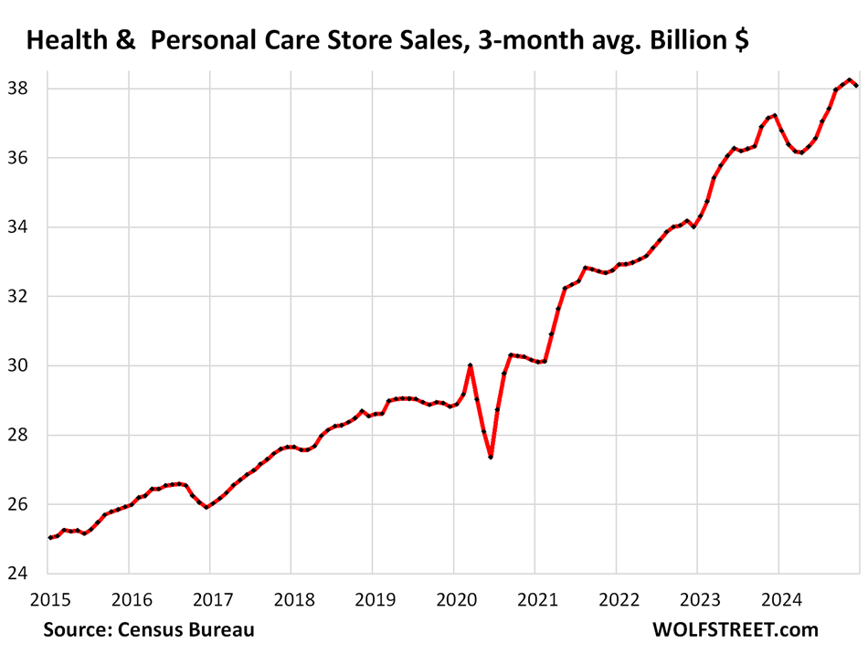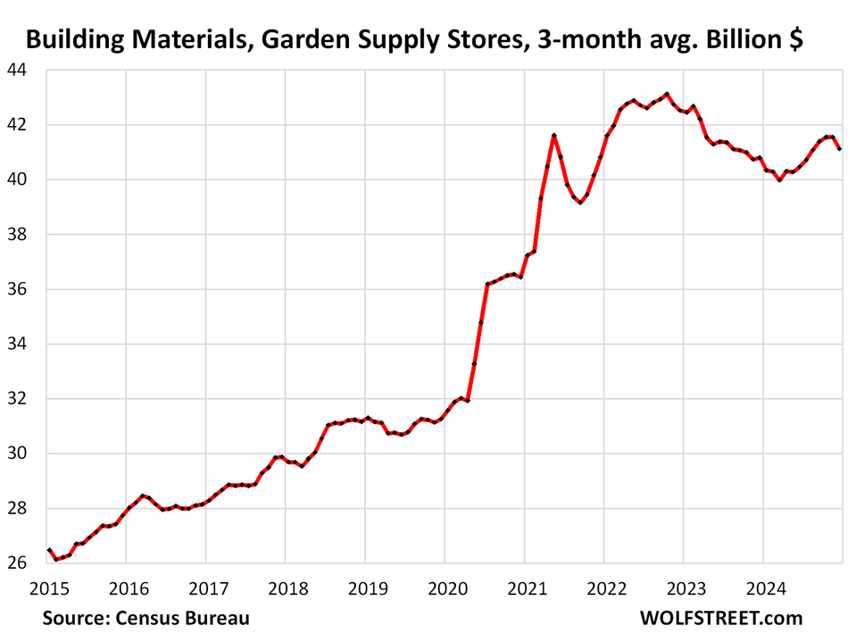 Building materials, garden supply and equipment stores (6% of total retail). The enormous remodeling boom during the pandemic fizzled in late 2022, and sales fell for a while. In 2024, sales started rising again from still very high levels, but late in 2024, they fizzled again: